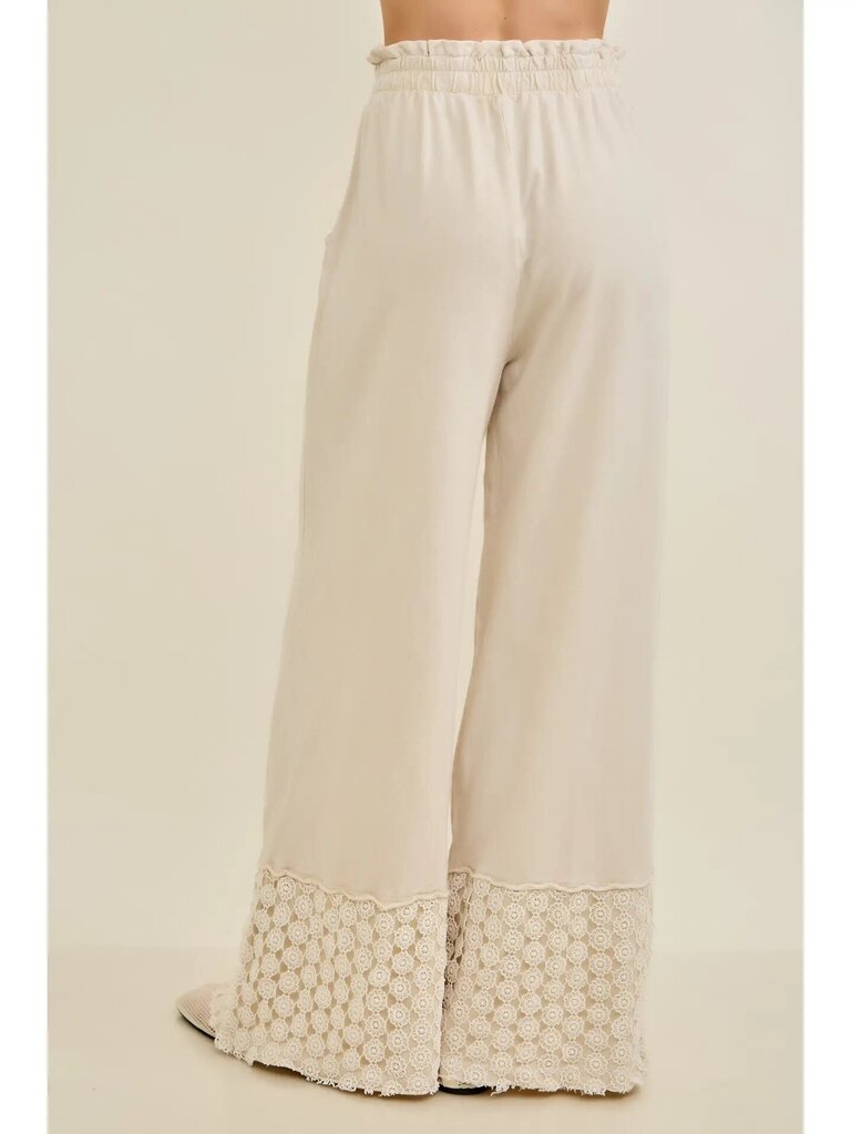 What truly sets them apart is the delicate doily-inspired trim at the hem. This intricate detail adds a soft, feminine touch and a hint of vintage charm, making these pants just as suitable for casual days as they are for dressed-up moments.