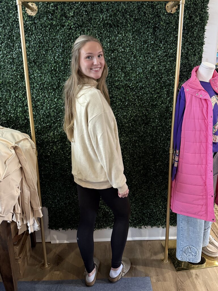 Transition into spring with our new reversible mock neck! One side is a smooth, buttery material and the other side is a soft fleece! Comes in 4 colors, fits roomy. Model is wearing a size small.